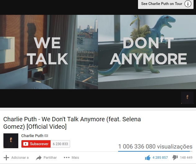 Videoclipe de We Don’t Talk Anymore de Charlie Puth & Selena Gomez chega a 1 bilião de visualizações