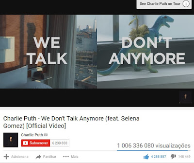 O videoclipe de We Don’t Talk Anymore, dueto de Charlie Puth & Selena Gomez, atingiu, recentemente, 1 bilião de visualizações na plataforma do Youtube. Esta é a primeira vez que a atriz e cantora conquista tal marco (segunda para o Charlie). Não deixes de conferir mais informações clicando em "Ler Mais":